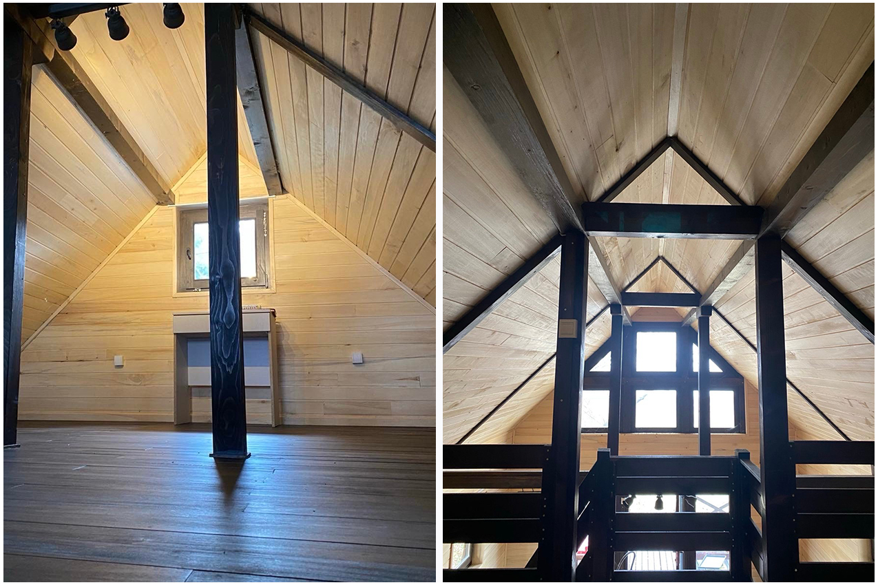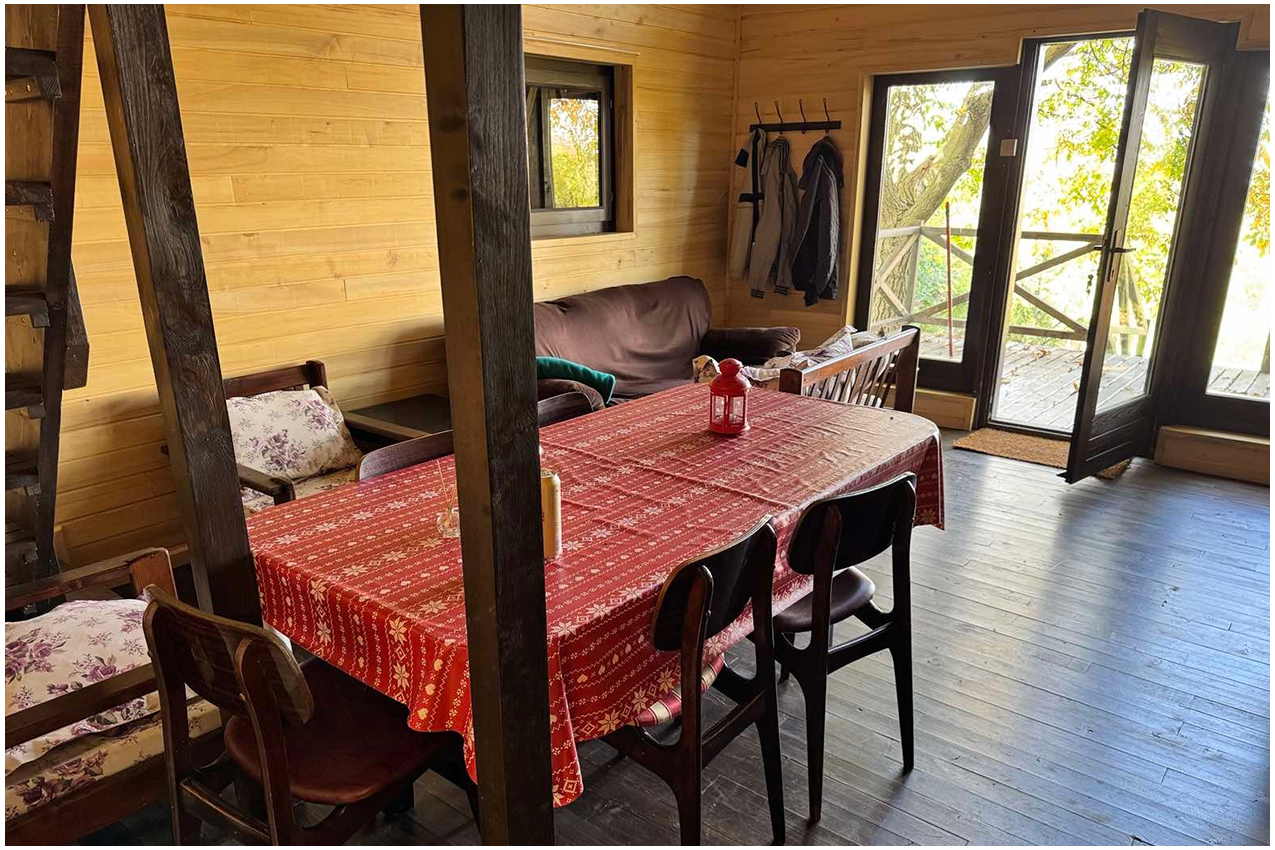 U donjem delu brvnare nalazi se kuhinja sa trpezarijom,kuhinjom i novim kupatilom.Iznad ovog dela je galerija,a postoji i podrum ispod polovine kuće.
